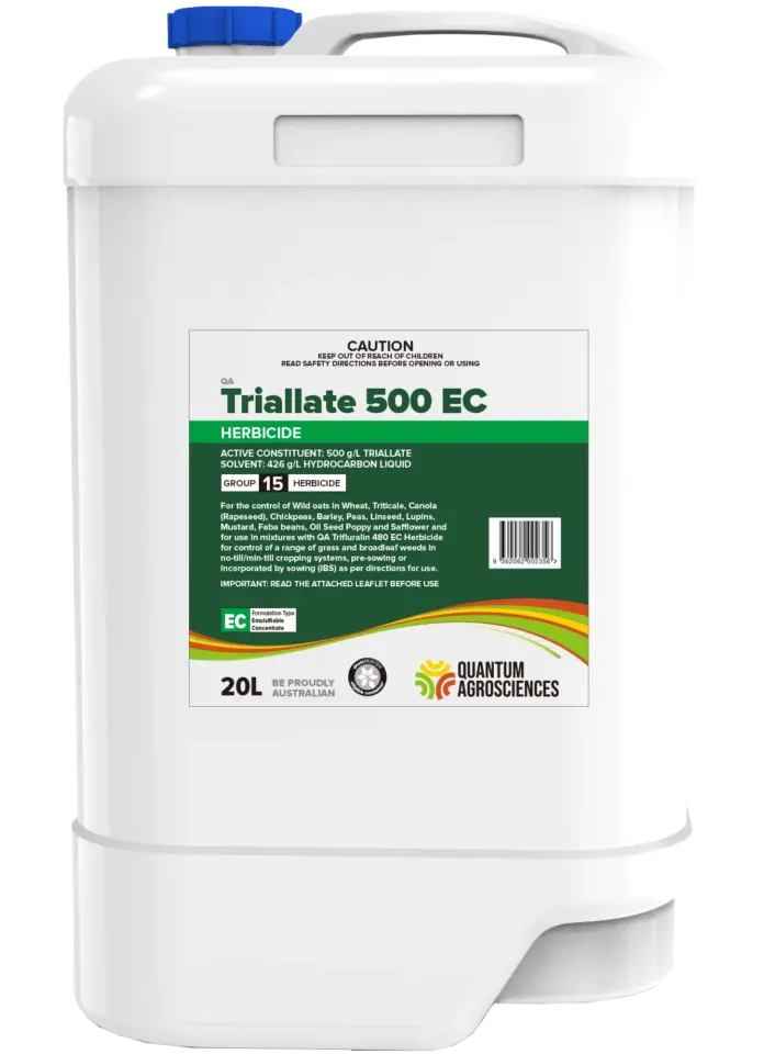 For the control of Wild oats in Wheat, Triticale, Canola (Rapeseed), Chickpeas, Barley, Peas, Linseed, Lupins, Mustard, Faba beans, Oil Seed Poppy and Safflower and for use in mixtures with QA Trifluralin 480 EC Herbicide for control of a range of grass and broadleaf weeds in no-till/min-till cropping systems, pre-sowing or incorporated by sowing (IBS) as per directions for use.